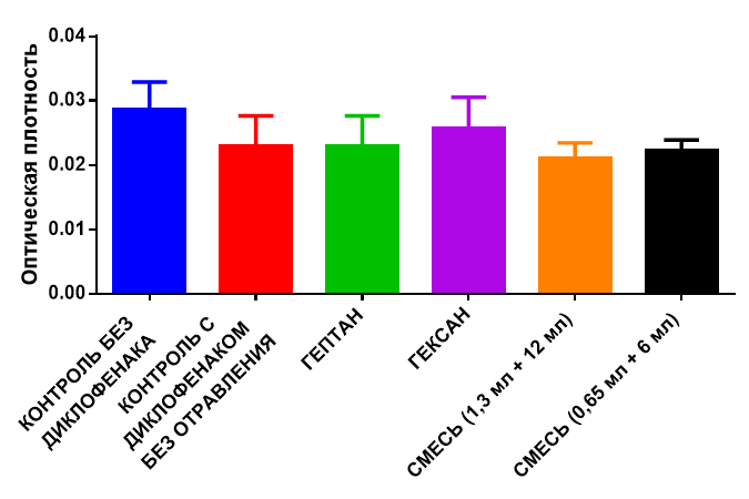 Впервые изучено влияние ингаляционного воздействия на мышей легких алифатических углеводородов гексана и гептана индивидуально и в виде их смесей на выраженность обезболивающего эффекта диклофенака в тесте Горячая пластинка. Установлено, что анальгетическое действие НПВС диклофенака нивелируется на фоне предварительного воздействия на организм мышей как индивидуальных углеводородов, так и их смесей, что является признаком эффекта антагонизма. Механизм такого влияния требует дополнительных исследований.