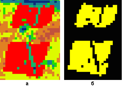 а – классификация ISODATA, б – переклассификация до 2х классов
